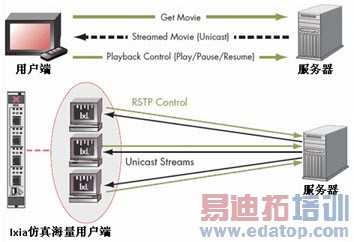 IXIA视频测试方案可以很好地对VOD视频服务器进行支持,由于目前各个厂家对VOD业务所采用的RTSP控制协议进行了不同程度和不同方式的修改和定制,要和VOD服务器进行互通有一定的难度,IXIA根据这一特定的测试要求,可以对RTSP的流程进行灵活定制和调整,支持RTSP各个命令信息交互的定制,支持的命令包括Describe,Setup,Play,Pause,Get Parameter,Set Parameter,Teardown等,这些灵活的特性可以保证IXIA能够和业界几乎所有的VOD服务器进行互通并进行性能测试。这是IXIA在视频服务器测试方面非常重要的特性。目前,IXIA是Seachange公司视频服务器认证的测试工具(http://www.catr.cn/ctu/cshdt/200710/t20071031_646571.htm)。可以和Thompson,Bitband,Harmonic,Darwin以及Windows Media Server等业界常见的视频服务器互通并提供性能测试。图3是VOD服务器交换过程与IXIA进行性能测试示意。