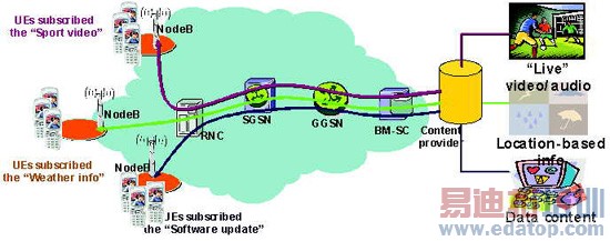 为了有效地利用移动网络资源,3GPP/GSM全球标准化组织3GPP提出了组播和广播业务(Multimedia Broadcast/Multicast Service, MBMS),在移动网络中提供一个数据源向多个用户发送数据的点到多点业务,实现网络资源共享,提高网络资源的利用率,尤其是空口接口资源。3GPP定义的MBMS不仅能实现纯文本低速率的消息类组播和广播,而且还能实现高速多媒体业务的组播和广播,这无疑顺应了未来移动数据发展的趋势。