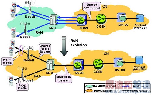 同P-t-P(Point-to-Point)方式相比,P-t-M方式传输可以让所有定制同一MBMS业务的用户在一个公共传输信道(FACH)上接收相同数据,无线信道的效率得到很大的提高。