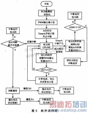 MSP430单片机内部具有高、中、低速多个时钟源,可以灵活地配置给各模块使用以及工作于多种低功耗模式,大大降低控制电路的功耗提高整体效率;430F449有ADC12模块能够实现12位精度的模数转换、硬件乘法器以及带有PWM输出功能的TIMERA和TIMRB定时器,使得整个电路不需要任何扩展就能完成对电源输出电压、电流的实时采集、PI控制、PWM输出;同时MSP430F449带有内部LCD驱动模块,直接将液晶显示屏连接在芯片的驱动端口即可,电路结构极为简单。本设计的软件采用C语言编写,整个程序包括的子模块有:键盘控制模块、A/D电压和电流采集模块、PI控制模块和PWM波发生模块等几个部分,软件流程图如图6所示。