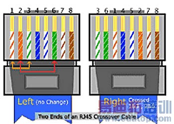 交叉网线(图B)是用来连接同样设备的双绞线。它可以应用在个人计算机到个人计算机、交换机到交换机或者路由器到路由器等类型的连接中。