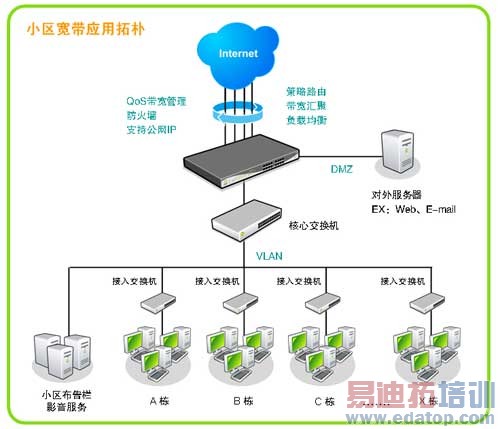 Ø 虚拟局域网VLAN:可将小区网络划分为不同的局域网,各个虚拟局域网广播包互不相通,限制病毒与无用信息流通,以方便对小区进行特定的管理、局域网间的隔离和防止广播风暴。