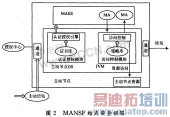 为解决MABAN中主动结点的安全问题,现设计一个通用的MABAN结点的安全性框架MANSF(MobileAgent-Based Active Network node Security Framework)。此规范符合主动网络安全工作组提出的主动网络结点的安全规范,而且具有可扩展性和通用性等特点。MANSF结点的安全框架图见图2。