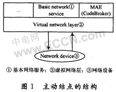 在MANet中,每个内部网络结点都是一个具有计算能力的主动结点。每个主动结点不仅具有有相当功能的处理器,而且也具备由多种存储设备组成的多级存储系统。实际上它是一个由网络硬件设备、处理机以及相应的软件所组成的系统,如图1所示。虚拟网络层完成传统网络中数据链路层的功能,它通过网络设备接收数据包,对数据包的格式进行识别,并依据数据包格式对其进行分解,然后将数据包所携带的代码和数据等传送给移动代理运行环境MAE,MAE将程序代码作为代理装载运行。代理实现的是客户化的协议程序,它在运行过程中可能还要和基础网络服务,部分进行交互,调用最基本的网络服务,如获取本地以及相邻结点的信息、下一转发结点的地址以及本地结点状态的存取等。经过代理处理后的数据交由虚拟网络层重新封装,然后通过网络设备发送给下一个主动网络结点(或几个网络结点)。