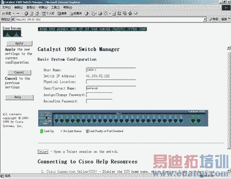 第3步:单击"确定"按钮,即可建立与被管理交换机的连接,在Web浏览器中显示交换机的管理界面。如图11所示页面为与CiscoCatalyst1900建立连接后,显示在Web浏览器中的配置界面。首先看到的是要求输入用户帐号和密码,这时您就输入在上面已设置好的交换机配置超级用户帐号和密码进入系统。