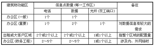每个工作区信息点数量可按用户的性质、网络构成和需求来确定。下表做了一些分类,仅提供设计者参考。
