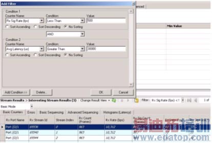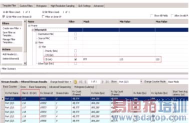 MEF规范对城域以太网的性能进行了详细和规范的定义。在测试中,既要对电信级量的测试业务记录众多MEF定义的指标以及其他有用的指标,又要能快速定位特定的业务或者问题业务情况。这两个方面是彼此矛盾。Spirent Testcenter每端口能实时分析65535条独立的测试流(Stream),为每条流提供了包括收/发帧总数和速率、丢包、时延、时延分布、抖动、抖动分布、顺序/乱序、各种类型错包等超过50个统计量,并提供了灵活的结果过滤方式,帮助用户在测试中能全面、快速、灵活地记录和查找结果。