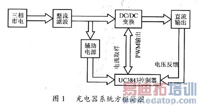 整个系统由输入单元、直流变换单元、控制单元和输出单元组成。输入单元是三相无零线市电;直流变换单元采用双管BUCK-BOOST。电路,它可以适应市电304~456V的大范围变动。控制单元采用电源专用电流型PWM芯片UC3843,它通过检测输出的电压和电流信号来控制开关管的通断和调整输出电压;输出单元由功率二极管和滤波电容组成。其系统方框简图如图1所示。