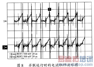 图8为充电器工作在非限流状态时,两充电器模块控制器电流取样端的电压波形图,即图2中取样电阻R1两端的电压波形图。此时从图8中可以看出,两充电器模块电流取样均为0.6V,说明并联的两模块工作在均流状态。