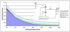 图 1 显示的是降压电源频率与体积的关系。频率为 100 kHz 时,电感占据了电源体积的大部分(深蓝色区域)。如果我们假设电感体积与其能量相关,那么其体积缩小将与频率成正比例关系。由于某种频率下电感的磁芯损耗会极大增高并限制尺寸的进一步缩小,因此在此情况下上述假设就不容乐观了。如果该设计使用陶瓷电容,那么输出电容体积(褐色区域)便会随频率缩小,即所需电容降低。另一方面,之所以通常会选用输入电容,是因为其具有纹波电流额定值。该额定值不会随频率而明显变化,因此其体积(黄色区域)往往可以保持恒定。另外,电源的半导体部分不会随频率而变化。这样,由于低频开关,无源器件会占据电源体积的大部分。当我们转到高工作频率时,半导体(即半导体体积,淡蓝色区域)开始占据较大的空间比例。