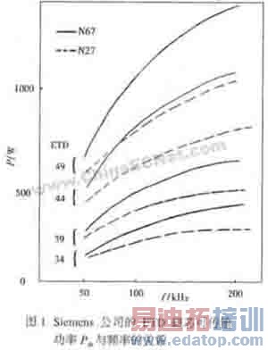 这里,我们重点讨论(fBmaxAe)参数(暂不讨论绕组设计参数Wd)。增大磁芯尺寸(增大Ae)可提高变压器通过功率,但当前开关电源的目标是在给定通过功率下要减小尺寸和重量。假定固定温升,对一个给定尺寸的磁芯,通过功率近似正比于频率。图1示出变压器可传输功率Pth与频率f的关系。提高开关频率除了要应用快速晶体管以外,还受其它电路影响所限制,如电压和电流的快速改变,在开关电路中产生扩大的谐波谱线,造成无线电频率干扰,电源的辐射。对变压器磁芯来说,提高工作频率则要求改进高频磁芯损耗。图1中N67材料(西门子公司)比N27材料有更低的磁芯损耗,允许更大的磁通密度偏移ΔB,因而变压器可传输更大的功率。图2示出磁芯损耗与频率的关系。磁芯总损耗PL与工作频率f及工作磁通密度B的关系由下式表示: