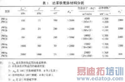 新发布的"软磁铁氧体材料分类"行业标准(等同IEC61332:1995),将高磁通密度应用的功率铁氧体材料分为五类,见表1。每类铁氧体材料除了对振幅磁导率和功率损耗提出要求外,还提出了"性能因子"参数(此参数将在下面进一步叙述)。从PW1~PW5类别,其适用工作频率是逐步提高的,如PW1材料,适用频率为15~100kHz,主要应用于回扫变压器磁芯;PW2材料,适用频率为25~200kHz,主要应用于开关电源变压器磁芯;PW3材料,适用频率为100~300kHz;PW4材料适用频率为300kHz~1MHz;PW5材料适用频率为1~3MHz。现在国内已能生产相当于PW1~PW3材料,PW4材料只能小量试生产,PW5材料尚有待开发。