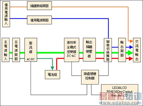 ON-LINE UPS主要架构包含:静态旁路电路、交流变直流(AC-DC)整流器、直流变交流(DC-AC)逆变器、及控制、侦测电路、维修旁路。