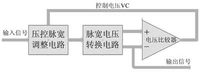同锁相环电路利用负反馈机制锁定相位的原理类似,我们同样可以利用负反馈机制构建简单系统来调整信号占空比。该系统主要有以下几个模块构成:压控脉宽调整器、脉宽电压转换器和电压比较器等。系统模块图如图3所示。