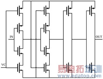 设计该电路时,传输信号反相器中的MOS管采用最小特征尺寸,并保证较大的宽度,使MOS管开关迅速,提高电路的工作频率;作为电流源使用的MOS管,为减少沟长调制效应,晶体管的长度应该比较大,这样对减少噪声也有帮助。另外要注意的是,当控制电压处于电源电压一半时,调整P、N电流源电流基本一致,这一要求确定了它们的相对宽长比,对扩大电路工作范围有重要的作用。由于电路调整了信号上升/下降的延时,有可能在高频应用时会对信号的完整性有所伤害,因此必须在该电路的输出加上缓冲器,根据负载决定缓冲器的驱动能力。为了适应后续模块比较的要求,需要产生相位互补信号。该电路可由两条反相器链组成。由于正相路径比反相路径少一级,为保证信号的相位互补,我们对正相路径的负载增加MOS电容,通过增大正相路径延时来达到互补的要求。