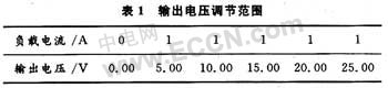 (5)电路主要测试数据。接上电源变压器和整流滤波电路以后对电路进行测试的结果为:电路在负载为1 A时输出电压调整范围如表1所示;在输出电压为额定值(24 V)下的负载特性如表2所示。电网电压波动±10%(负载电流1 A)情况下输出电压如表3所示。