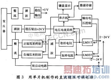(3)用单片机制作的可调直流稳压电源。该电路采用可控硅作为第一级调压元件,用稳压电源芯片LM317,LM337作为第二级调压元件,通过AT89CS51单片机控制继电器改变电阻网络的阻值,从而改变调压元件的外围参数,并加上软启动电路,获得0~24 V,0.1 V步长,驱动能力可达1 A,同时可以显示电源电压值和输出电流值的大小。