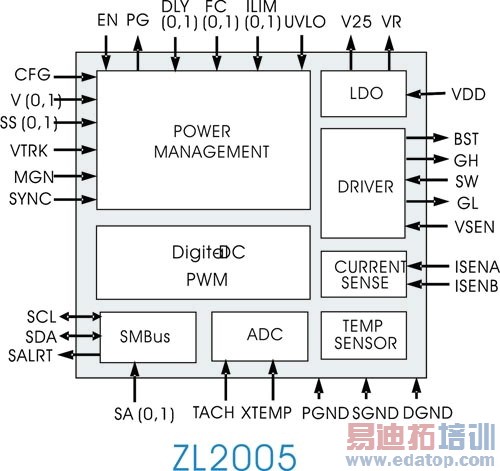 Zilker Labs推出电源管理IC ZL2005,功能框图示于图3。ZL2005特性为: