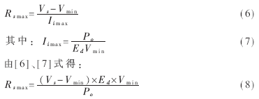 另外由图可知当Vs选定后,工作点就决定于电源内阻Rs。要使工作点永远不会进入非有效工作区,负载线斜率(-1/Rsmax)应有一个极限,即电源内电阻Rs应有一个上限Rsmax。由图可知:
