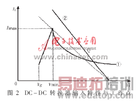 图2中①是一般DC-DC转换器的输入特性曲线,可见它的输入有一定的动态范围,其输入特性曲线可明显地分成三个区间。当Vig≤Vi≤Vmin时,DC-DC转换器处于启动工作的过渡状态,此间DC-DC转换器从电源吸取的电流随Vi快速上升,直到输出达到设定值时输入电流达到最大值Iimax;在此段内DC-DC转换器或许能工作,但是系统效率将很低,包括电源效率和DC-DC转换器的转换效率都比较低。Vminis区间是DC-DC转换器的有效工作区,在此区间内DC-DC转换器有较高的而且比较稳定的转换效率,所以综合来看调节器的工作点应选择在此段内的高端。