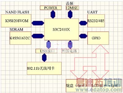 NAND FLASH用于存放启动程序、操作系统、TCP/IP协议栈、驱动程序和相关应用程序。S3C2410X支持NAND FLASH Boot Loader,系统上电后,S3C2410X通过内置的NAND FLASH CONTROLLER将NAND FLASH中的启动代码加载到其内部叫"Steppingstone"的4KB SRAM buffer执行启动任务,而不需要经过外部的SDRAM进行系统启动,从而加快整个系统的启动过程。等启动完成后,运行操作系统,这时的代码以及后来的应用程序都在外部的SDRAM执行。操作系统启动完成后,就可以执行设计的应用程序,通过RS232/485接口进行数据采集,再通过802.11b无线网卡将数据传输出去。S3C2410X的所有GPIO都被引出来,以备将来系统功能的扩展。