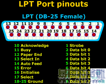 让我们现在快速地浏览一下一个LPT端口的引脚分布: