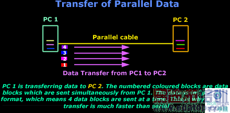 此图显示的是一个并行传输。在串行传输中每次都是传输一个数据块,而并行,更确切地说是在这个例子中,每次则是四个数据块一起传输。由于并行端口同时在多个电线上传输数据,因此它比串行快。