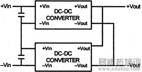 另一种技术是采用两个电源,这两个电源的输入串联连接、输出并联连接(见图4)。这里也存在由于元件变化所引起的电容器电压不平衡,例如,可导致一个dc-dc变换器工作在比另一个dc-dc变换器较高的占空比和较高的平均输入电流。此问题是可以设法解决的,但需要对两上变换器的整个控制进行关注。在相同输出功率下,两个变换器的总元件数多于单个变换器的元件数。两个dc-dc变换器所用较低电压和较低电流元件,所以,成本很低。