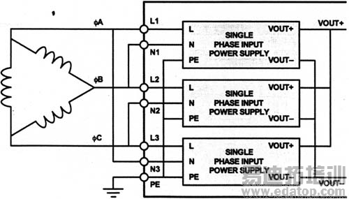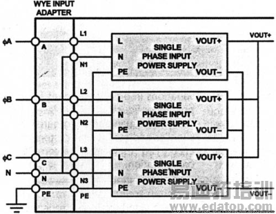 图5 从三相Y形ac电源连接三个单相输入ac-dc电源