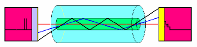 光在光纤中的传播过程被称为"全内反射"(TIR);通过使用两种具备不同反射率的玻璃也可能实现这个过程。内芯有一个高反射率的指数而外覆层有一个低反射率的指数。这个反射的原理与你观察池塘是一样的。池塘中的水比空气的反射率指数高一些,因此如果你从一个小的角度观察池塘时,你将看到周围事物的一个反射,但是,如果你以一个垂直的角度观察时,你可能看到的是池塘的底部。