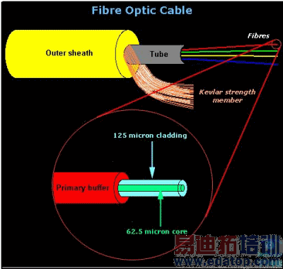 光纤电缆有很多种类,但在本文中我们的目的是探讨最常见的类型——62.5/125微米光纤保护束管。数字表示的是纤维芯和包裹层的直径,它是微米为测量单位的,即百万分之一米。