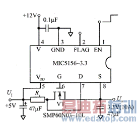 使用低压差线性稳压器mlc5l56,以及n沟道功率mos场效应管vt,,从而形成一个压差非常低的稳压器,提供固定的3.3v,5.0v或可调的电压,如图5所示。mlc5156利用pc的12v电源驱动场效 应管,当输出电压达到3.3v时,flag脚输出高电平。若此脚接入另一场效应管,此时可将5v电源接人第2 负载,该电路可用于某些双电源处理器。rs为限流电阻,其作用是使输出电流不大于12a。