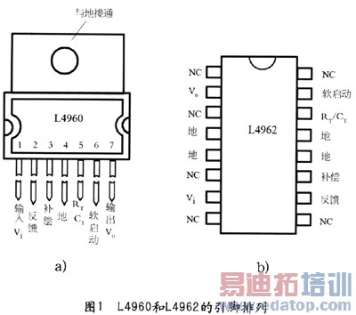 由一选编L4960和L4962是SGS公司生产的降压型开关集成稳压器,国内型号为CW4960~CW4962。L4960(CW4960)采用TO一220形式封装,L4962(CW4962)采用DIPl6封装形式,其引脚排列如图l所示。