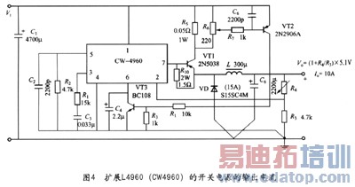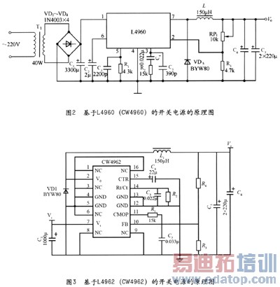 基于L4960(CW4960)的开关电源的原理图如图2所示。L4960(CW4960)的引脚l(Vin)为直流侧电源输入端,最大直流侧输入电压为50V,通过调节引脚2(FB)的电压可以调节输出电压(Vo)。