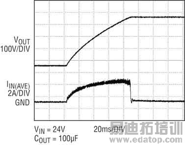 其中,VOUT是输出跳变电压,VRIPPLE是输出纹波电压,freq是充电/放电频率。通过让变压器体积加大和提供强制空气冷却,可以提高最大可用输出功率。对于输出电压高于450V的情况而言,必须用一个有更高匝数比和更高主端电感的变压器取代图1中的变压器。图2显示一个在不到100ms时间内充电到400V的100μF输出电容器的充电波形和平均输入电流。