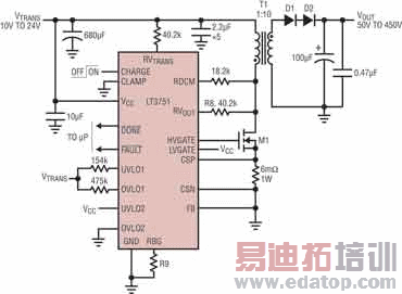 图1电路显示了LT3751的运作方式。其输出电压通过变压器的主端绕组检测。这种主端输出电压检测仅利用一个部件便保持了隔离作用,而且结构简单。输出电压在RVOUT引脚上被检测,并通过R8、R9和变压器匝数比的选择来调节。这一隔离电路运用片上差分 DCM比较器,以12~24V输入电压将一个电容器充至450V。