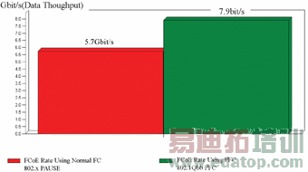因为FCoE机制必须支持存储数据的读写,所以所有网络存储路径下的终端设备和以太网交换机必须支持双向IEEE 802.3x流控制。尽管这样的效果可能不如Buffer-to-Buffer Credits机制那么理想,但是IEEE 802.3x暂停帧可以提供对应的功能性,来调节存储流量并防止阻塞和缓冲区溢出引起的丢帧。对于存储事务来说,这有助于增强流控机制的服务层级质量,使得最关键的任务的数据流在可能发生阻塞的情况下获得最高优先权。需要指出的是,以太网上常用的802.3x流量控制能够对控制报文和数据报文同时"暂停",但是基于流量控制的802.1Qbb 可以对特定优先级数据流进行转发控制。图3是一个运行IXIA IxExplorer FCoE测试功能时,启用以太网中的流量控制与802.1Qbb流量控制时对FCoE流量的影响。