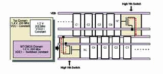其中,有一项已得到日渐普遍使用的技术是将设计分为多个"电压岛",如图3所示。虽然供电电压更低的电压岛性能也随之降低,但其动态功耗也将大幅降低。