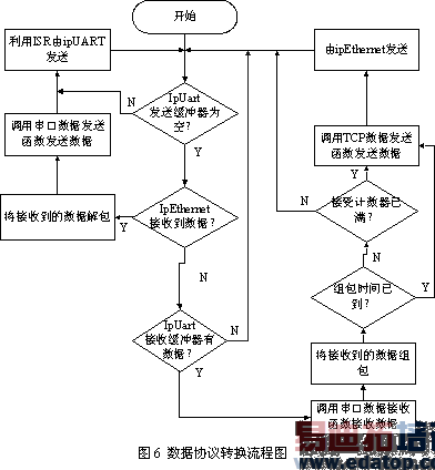 从图5中可以看出进入主循环后,首先对以太网口进行轮询,然后再对串口轮询,这样保证从以太网口来的指令能够优先及时地得到处理。如果轮询到端口有数据发送或接收,就对数据进行协议的转换和传输,其具体的流程如图6所示。
