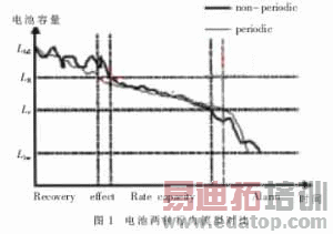 大多数有关低能耗设计的研究,都将电池隐式认为是一个理想的电荷储存器,即:存储某个固定的电荷总量,而且直到电荷全部耗尽时电压才退出标称值。然而在实际情况中,电池没有任何一处接近于理想电荷存储单元。由于电池的化学特性,电池在满电荷至临界低电荷放电期间其放电率受到很多因素的影响。其中最主要的两个因素是:the rate capacity effect和the recovery effect[7]。the rate capacity effect现象反映了电流负载和电池寿命的非线性反比关系,而且电池寿命变化率比电流负载变化率要快。这主要是由于电池在生命周期中所能释放的容量总和与放电电流有关。因为从能量转换角度看,当电流越大时,电池在将内存的化学能转变成电能时的效率越低。电池的这种非线性特征可通过Peukert公式[8]来说明;the recovery effect现象反映了当电池空闲时电池电容有自恢复效应。因为电池在没有放电时,电极——电解质周围的有效物质通过扩散的方法会被重新填充,电池容量会有恢复现象。若能利用该特性,将有利于降低系统能耗,延长电池寿命。