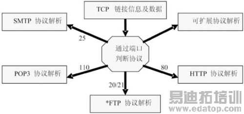 在TCP、IP解析的基础上实现了对FTP协议,HTTP协议,SMTP协议,POP3协议的并行解析。由于监听的网络同时会有多个人使用某个协议,我们建立了对应于各个TCP连接的虚拟端口,用于区分不同TCP链接的通信数据。图3.2描述了TCP连接与各个协议的关系。