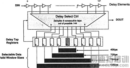 为了集中在无噪声环境下,所有工作都是基于"伸缩窗:(‘sliding window’)原理。此窗取输入数据的多个连续周期的抽点。为了在任何给定时间采样,所有数据周期都呈现在延迟链上。例如,数据率为1.25Gbyte/s,则全部7个数据周期呈现在延迟链中。AIL寄存沿延迟线给定点(取决于窗位置)的9个连续数据位。一个中心分接头寄存器(见图3)做为数据有效窗的参考点,而周围的寄存器确定窗宽度。根据来自延迟分接头寄存器的反馈,定时通过延迟单元数(128)的数据输入,选择数据眼最好是无噪声环境。