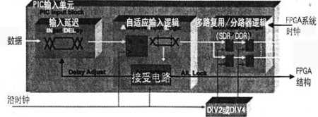 FPGA器件可解决此问题。输入缓冲器包含适合不同线路条件的专门逻辑。每个可编程I/O单元包含4个可编程I/O(见图2)。这些I/O的每个I/O都包含专门的逻辑,允许器件补偿由每个引脚高达2Gbyte/s性能引起的定时变化。其关键是输入延迟逻辑和自适应输入逻辑(AIL)。