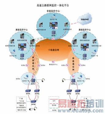 该系统集数字视频传输、视频管理、视频存储以及外网发布等功能为一体。 EV701中心设备有4个业务槽,可任意插拔编解码卡,最多支持8路视音频数据。采用H.264编码标准的EV702外场综合接入设备,将原来外场分散的摄像头、快球、云台、可变情报板、报警感应器等设备融为一体,同时也支持MPEG编码标准的视音频接入。可以同时编码2路以上的视音频信号,支持双流传输,D1数据用于实时观看,CIF数据用于存储和Web网业务(包括对外发布实时图像和管理人员异地监控)。具备IP开关断功能,减轻了通信网络的压力。 路级中心、区域中心、省级中心分布式多级监控,由省中心统一设定权限,进行集中管理。