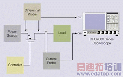 图1是标准开关电源的方框图。我们使用差分探头测量流经晶体管的电压,并使用电流探头测量流经晶体管的电流。接下来,我们将考察使用这一测试设备测得的开关损耗。