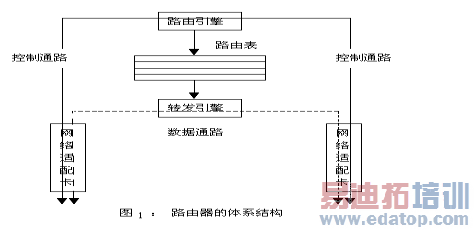 图1给出了一般路由器的逻辑体系结构。它主要由下面几部分组成 :路由引擎、转发引擎、 路由表、网络适配器和相关的逻辑电路等。转发引擎负责把从一个网络适配器来的数据包转发到另一个网络适配器出去。IP协议,包括对路由表的查找,构成了转发引擎中最主要的部分。由于每个通过路由器并需要其转发的数据包都要对路由表进行查找,所以路由表的查找效率如何往往决定了整个路由器的性能。路由引擎则包括了高层协议,特别是路由协议,它负责对路由表的更新。由于路由引擎不涉及通过路由器的数据通路,故它可用通用的CPU代替。