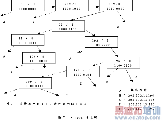 它的思想是:把32位IPv4地址主要分成4部分,每部分8位。在该结构中,Address-part[0-4]是IP地址中的一部分,Mask-part[0-4]是相应的掩码部分。Hit-next[0-4]是需要查找的目标IP地址与掩码部分相与后,与Address-part一致时所要查找的下一路由项所在地址的指针。,Miss-hit[0-4]则是相互不一致时,下一路由项所在地址的指针。Shift位则用于判断是否需要对IP地址中的下8位进行查找和判断。它只有在当前的8位IP地址与目标地址中相应的8位一致时,才会被置位。Stop位用于判断是否还需进行查找。它在IP地址查找结束时被置位,或没有比当前项所对应的IP地址更长的路由表项时被置位。