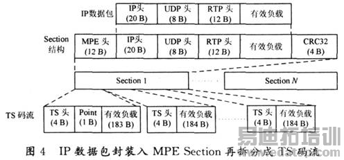 每一个IP包将在MPE Section中发送,RS数据将紧跟在最后一个MPE Section后,通过MPE-FEC Section传送,所有的MPE和MPE-FEC Section都有12 B的头部信息,和数据负载部分(IP数据或RS数据),在最后有4 B的CRC32校验数据。其中在头信息中有4 B的时间参数域,包括12个比特的开始地址,该地址表明了每个IP包或RS数据开始数据在MPE—FEC表中的位置,18个比特的Delta—T时间参数,以及1个比特的标志位表示最后一个IP包所在的Section和最后整个帧的结束,通常是最后一个MPE-FEC Section。所有的Section将被拆分为184 B作为TS包的有效负载部分,特殊情况是当作为Section的第一个TS包,将加上一个点(point)字节,该字节指名Section的第一个字节在TS包中的位置,然后加上183 B作为TS包的有效负载部分,并加上TS包的4 B的头信息,通过复用后发送到信道中传输,如图4所示。