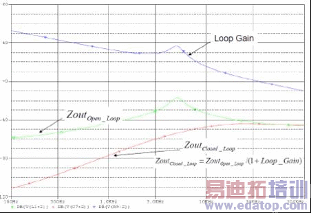 图 1闭环输出阻抗峰值 Zout 出现在控制环路交叉频率处