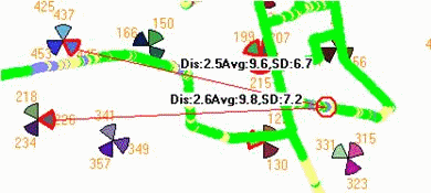 CNA具备非常友好的越区覆盖分析结果显示功能。除了存在越区覆盖的小区会标红以外(颜色是可定制的),在地图上会用不同的颜色显示每点被几个小区越区覆盖了,一目了然。当点击路测轨迹上的点时,会同时将该点连线到对应的若干个越区覆盖到此点的小区,并且在连线上显示该点到各小区的距离、各小区越区覆盖程度的均值和标准差。如下图1所示,SC445和SC226是判断为越区覆盖的小区(标红),这两个小区均越区覆盖到了红色点所在位置,且距离较大,影响也较为严重。